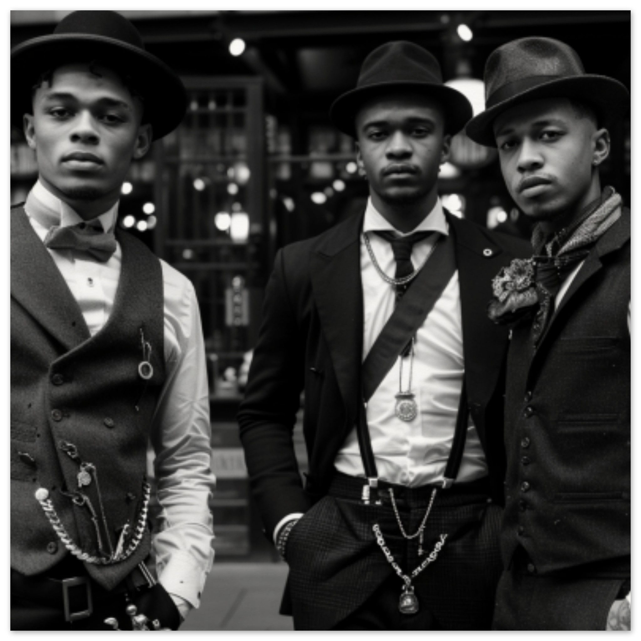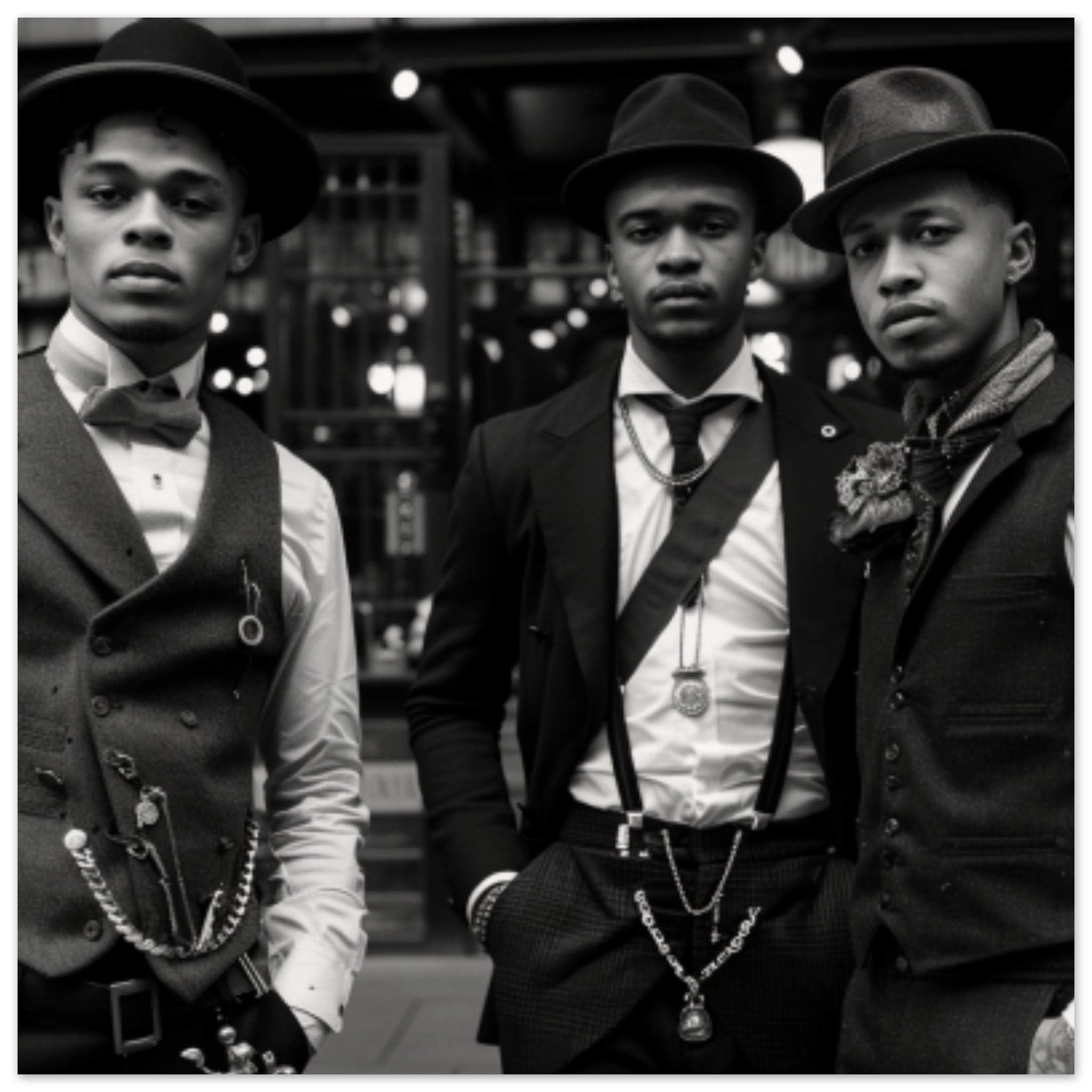 A group of well-dressed men in suits, vests, and fedoras walking down a street. The men are all wearing various fashion accessories like bow ties and scarves. The image is in black and white, with dominant colors of black, grey, and white. The men’s faces are visible, showcasing a range of expressions. The individuals are confidently striding forward, exuding a sense of style and sophistication. The background is also black, allowing the men’s outfits to stand out. The image conveys a classic and timeless sense of elegance and fashion.