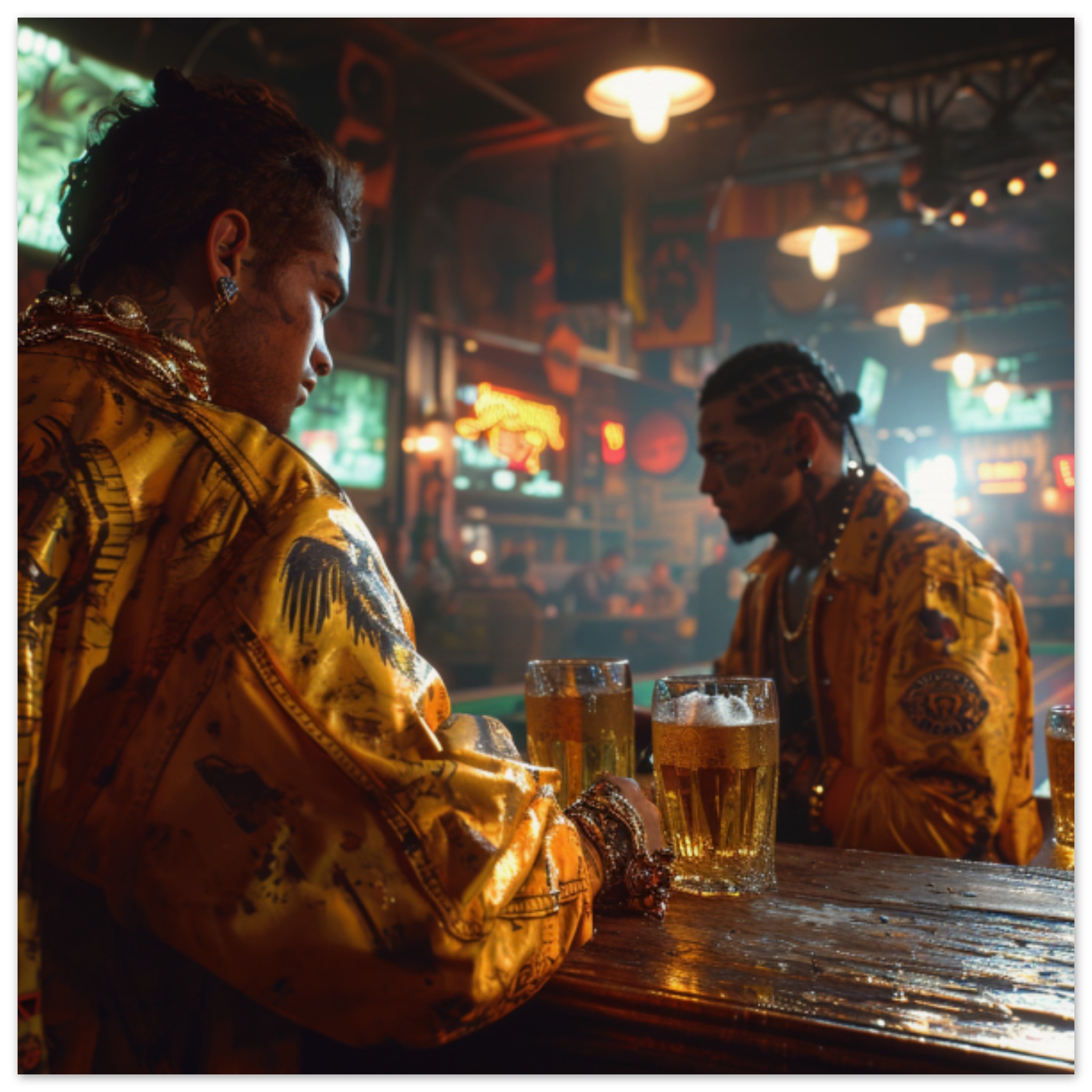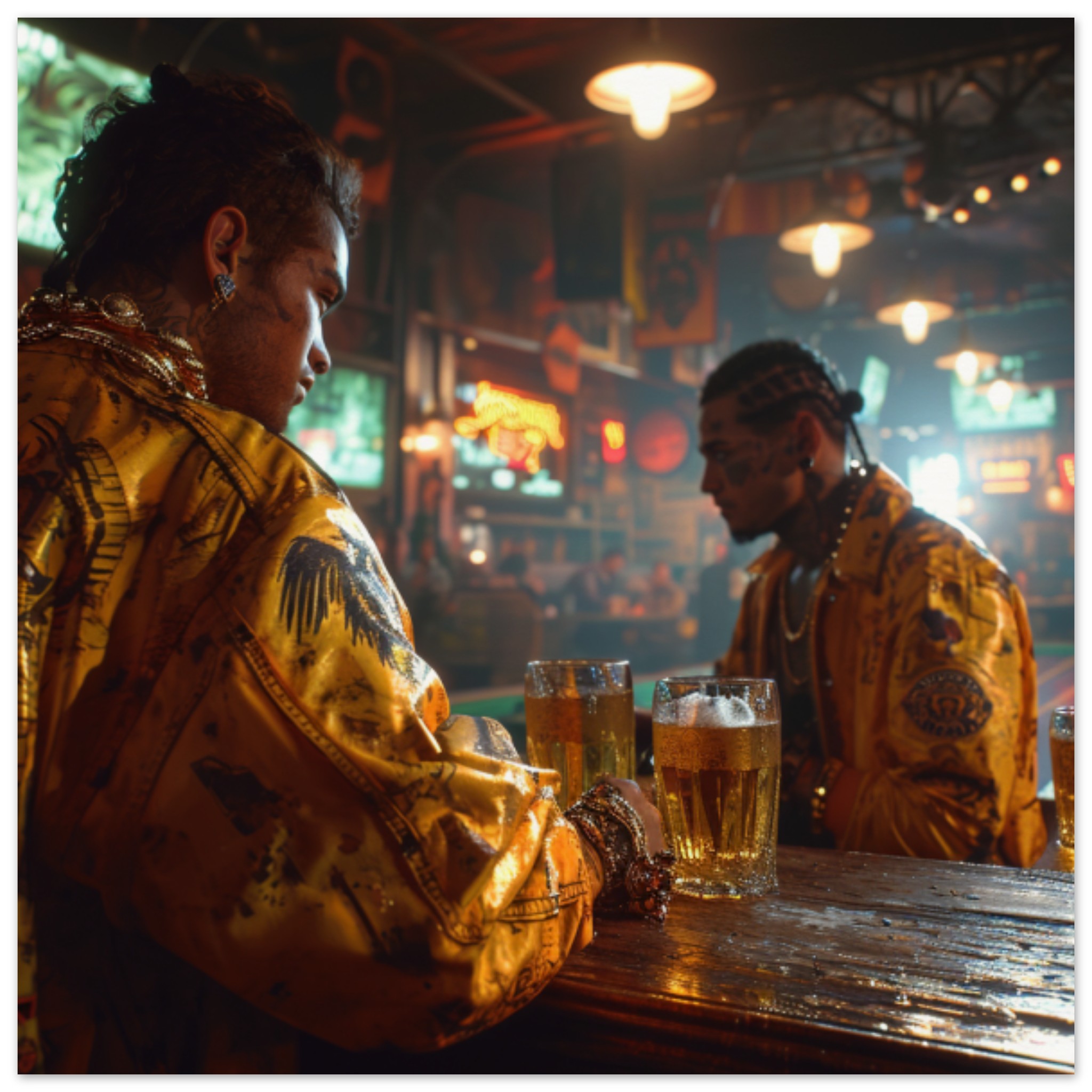 A group of men are gathered in a cozy bar, surrounded by dark brown walls and furniture. Two men are prominently featured in the scene: one sitting at a table with a glass of beer in hand, wearing a gold robe, and the other standing nearby with a beard and tattoos. The atmosphere is relaxed as they enjoy their drinks. The men are dressed in casual clothing and appear to be engaged in conversation. The bar is dimly lit, creating a warm and inviting ambiance for their social gathering.