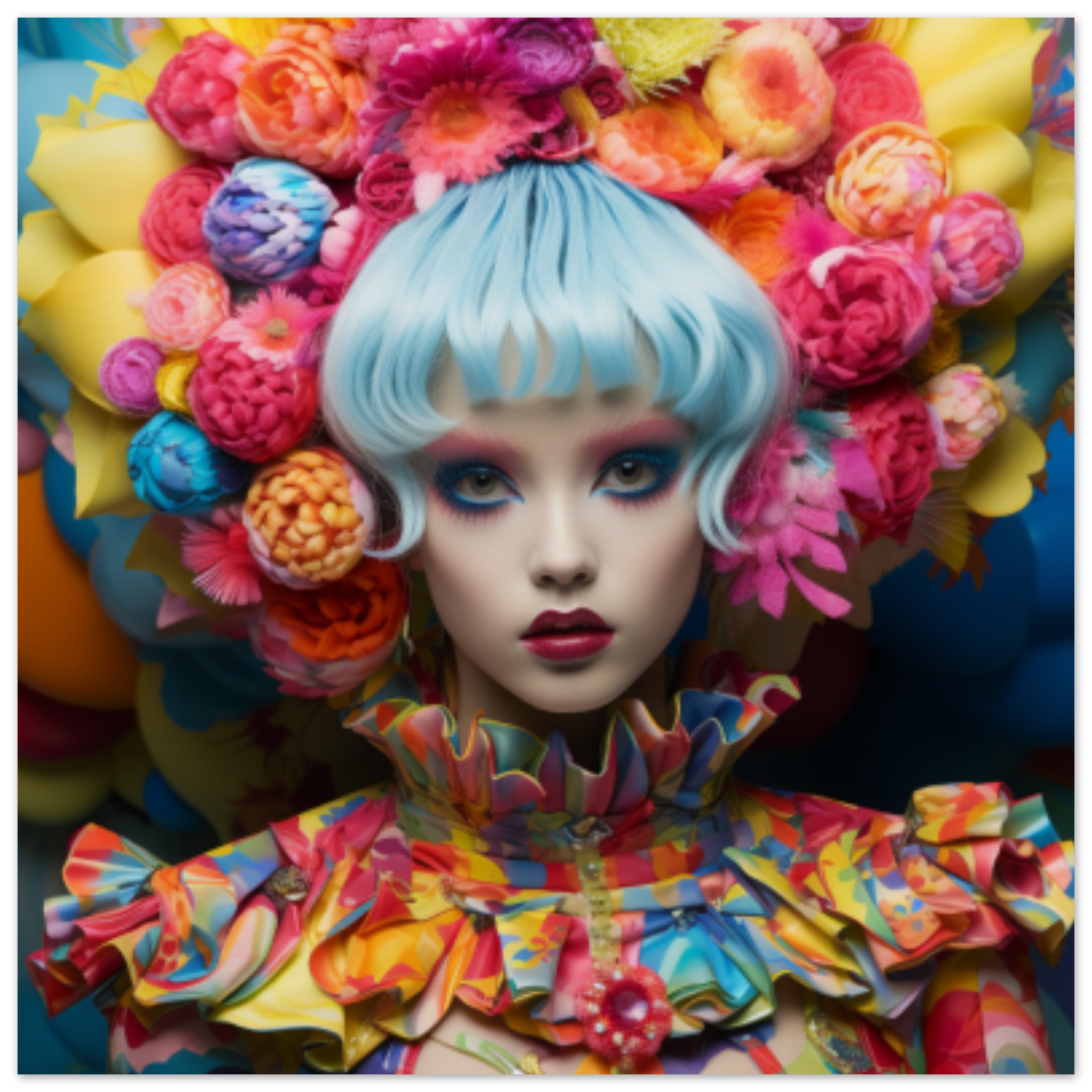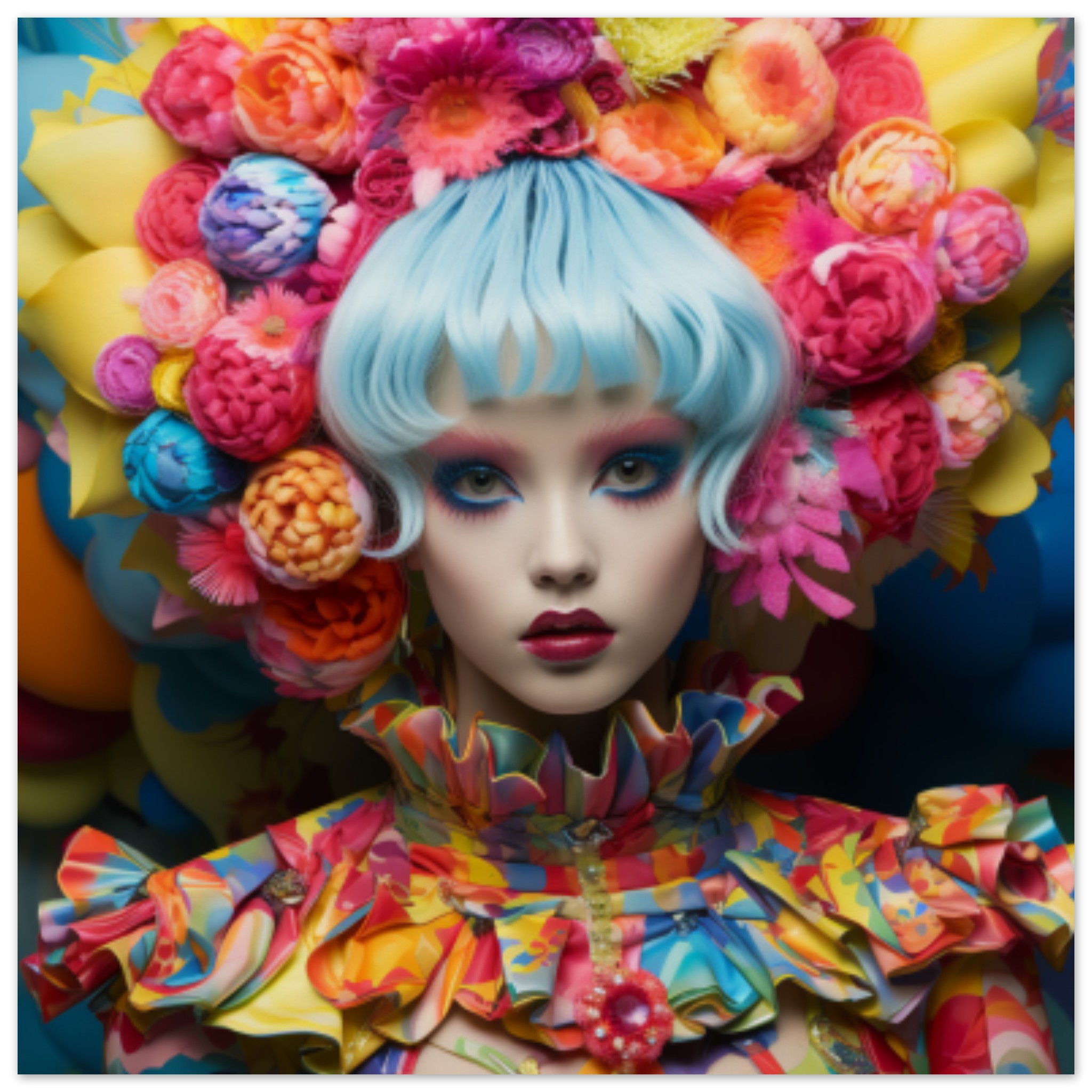 A woman with colorful hair stands out against a red background, with flowers adorning her head. Her striking appearance is accentuated by the black foreground. The image, with a resolution of 600×400, captures her face in a close-up shot, showcasing her unique style. The dominant color scheme consists of red and black, with an accent color of 12426B. Tags suggest the presence of a human face, pink elements, a person, flowers, and a doll. The image is not black and white and does not contain any identifiable objects.