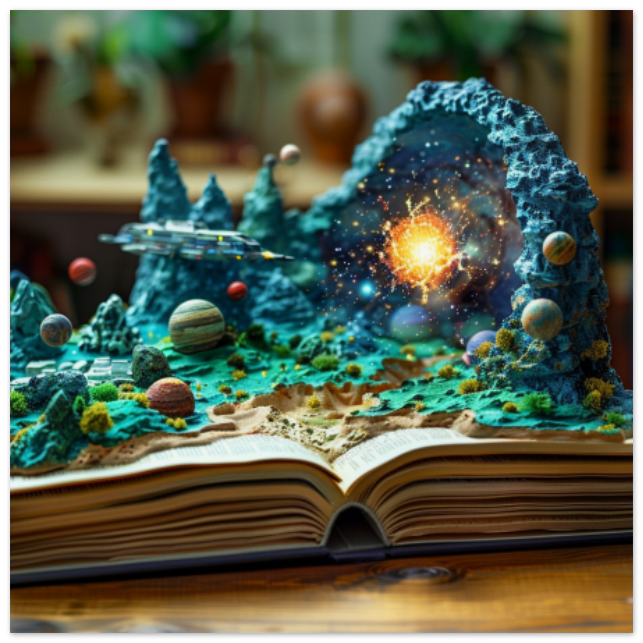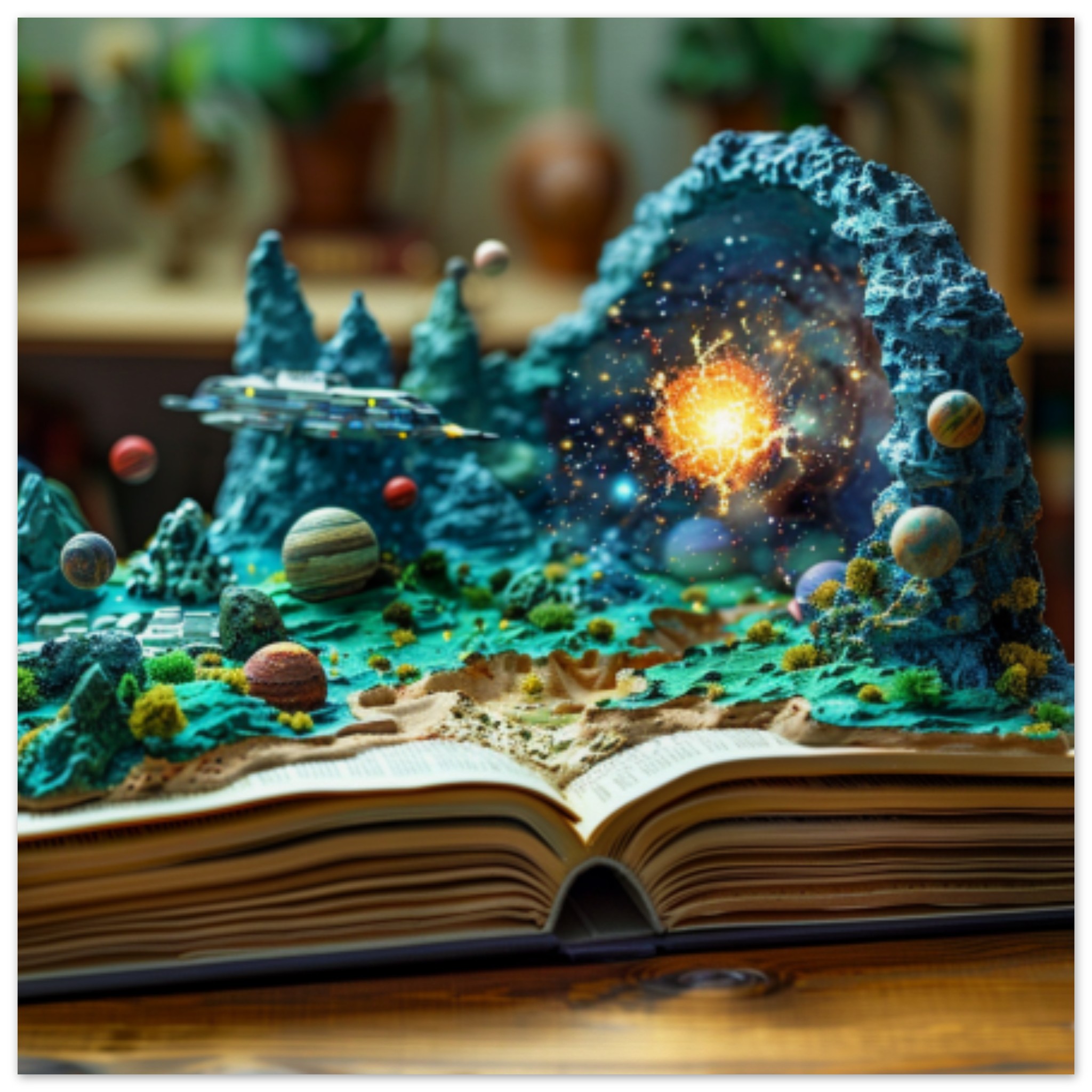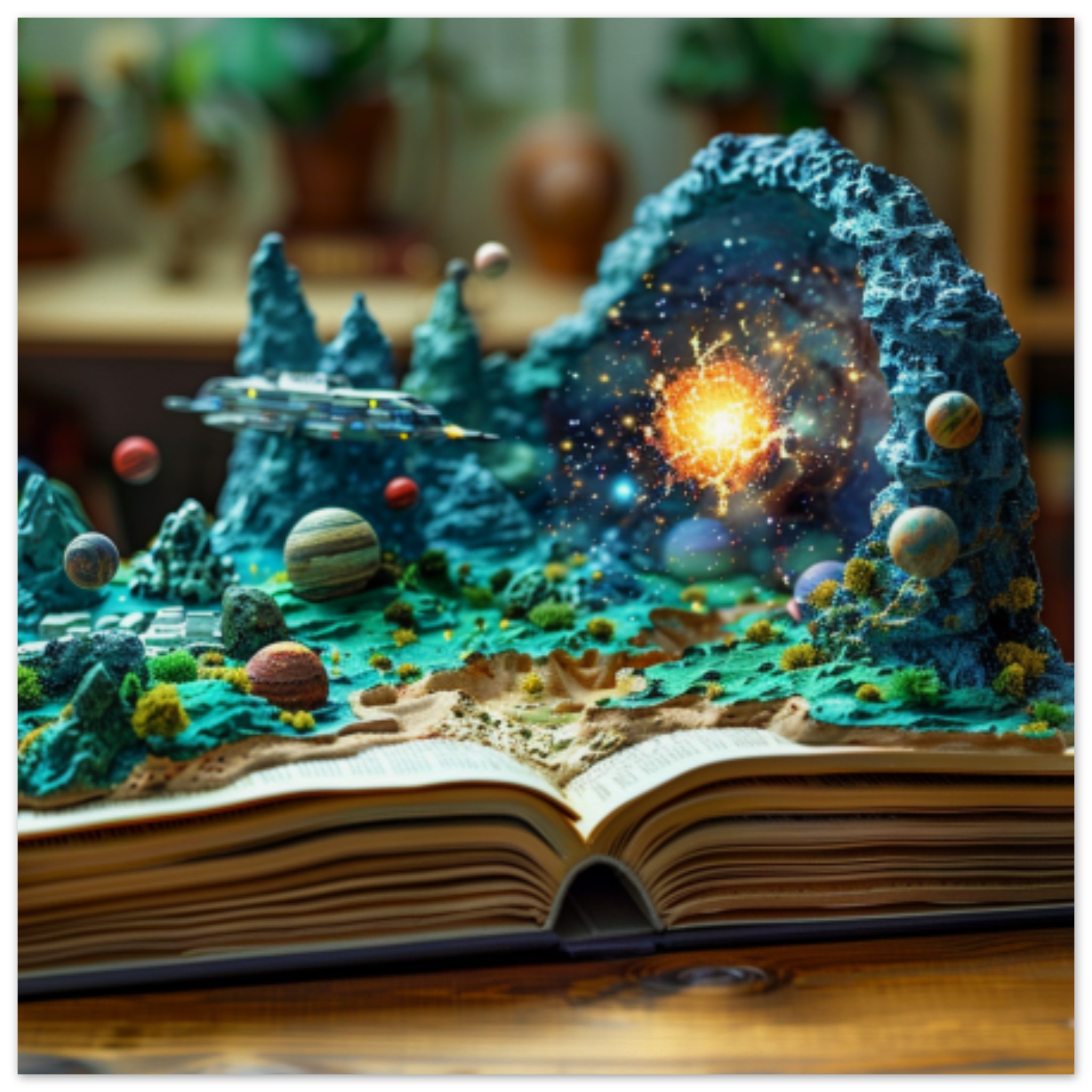 A brown open book is displayed, showcasing a model of a planet and various planets. The background is also brown, with dominant colors of black and brown. A plant is visible in the center of the image. The overall color scheme is warm and earthy, with an accent color of 66421A. The image is not black and white and does not contain any adult, racy, or gory content. The tags associated with the image include book, Christmas tree, birthday cake, indoor, and plant. The image is categorized as abstract and others, with no celebrities or landmarks present.