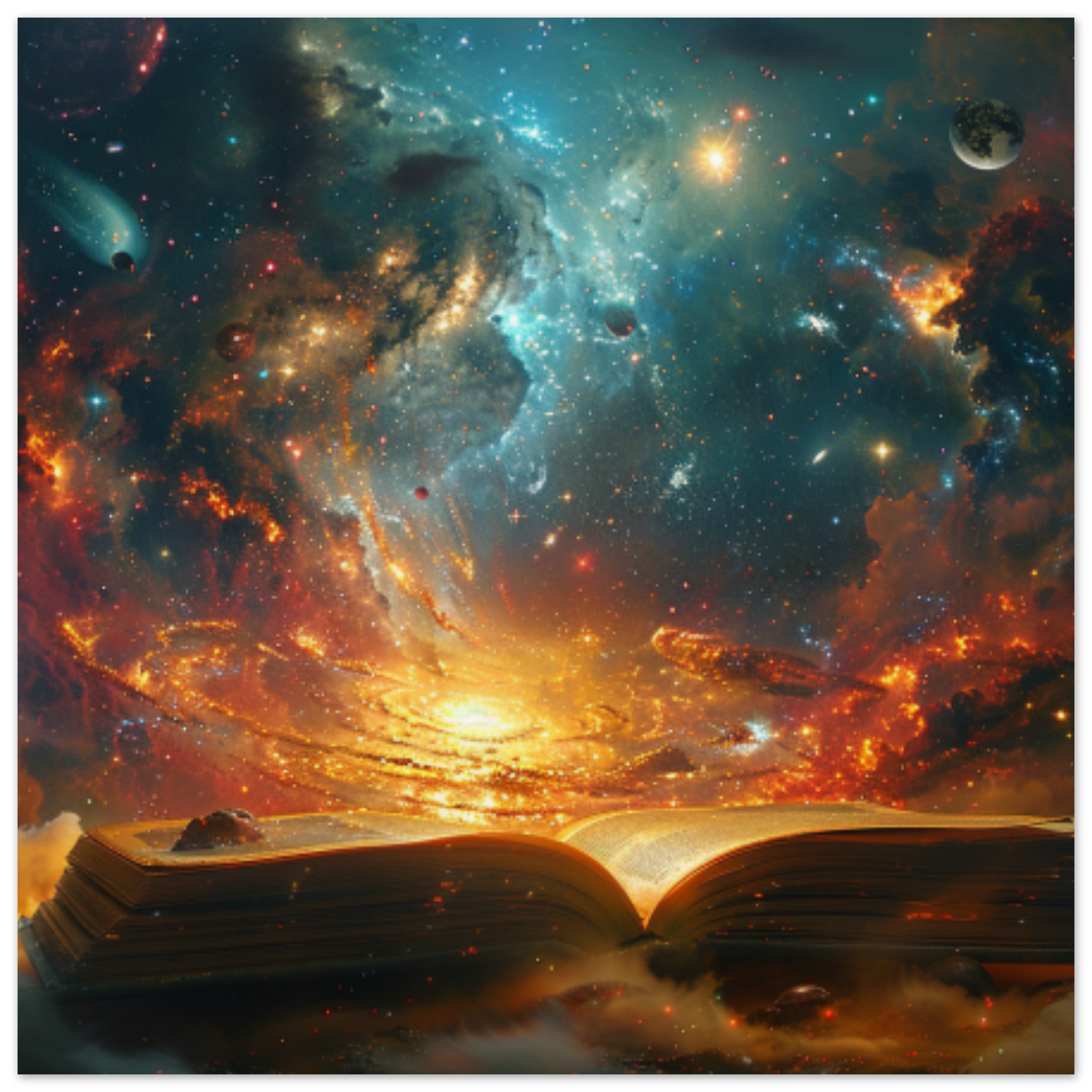 A captivating image featuring an open book set against a backdrop of stars and planets in outer space. The book is prominently displayed, with intricate details visible on its pages. The celestial scene behind it adds a sense of wonder and mystery, with various stars and planets scattered throughout the dark background. The overall color scheme includes dominant shades of brown and black, with a warm accent color of B0861B. This composition evokes a sense of exploration and discovery, inviting viewers to delve into the depths of the universe through the pages of the book.