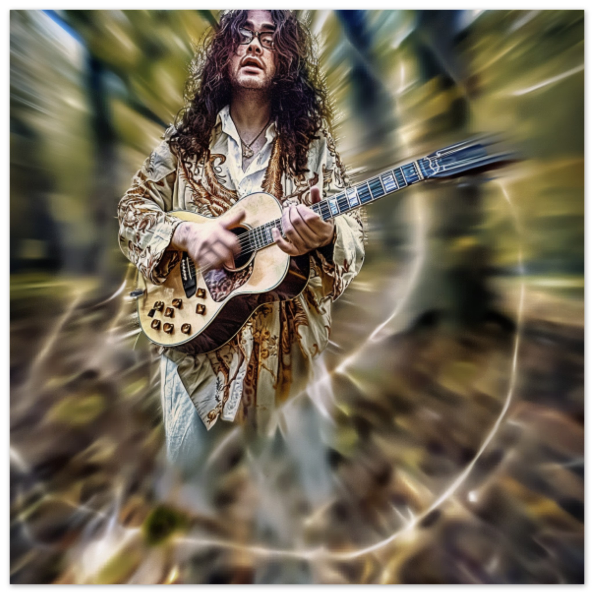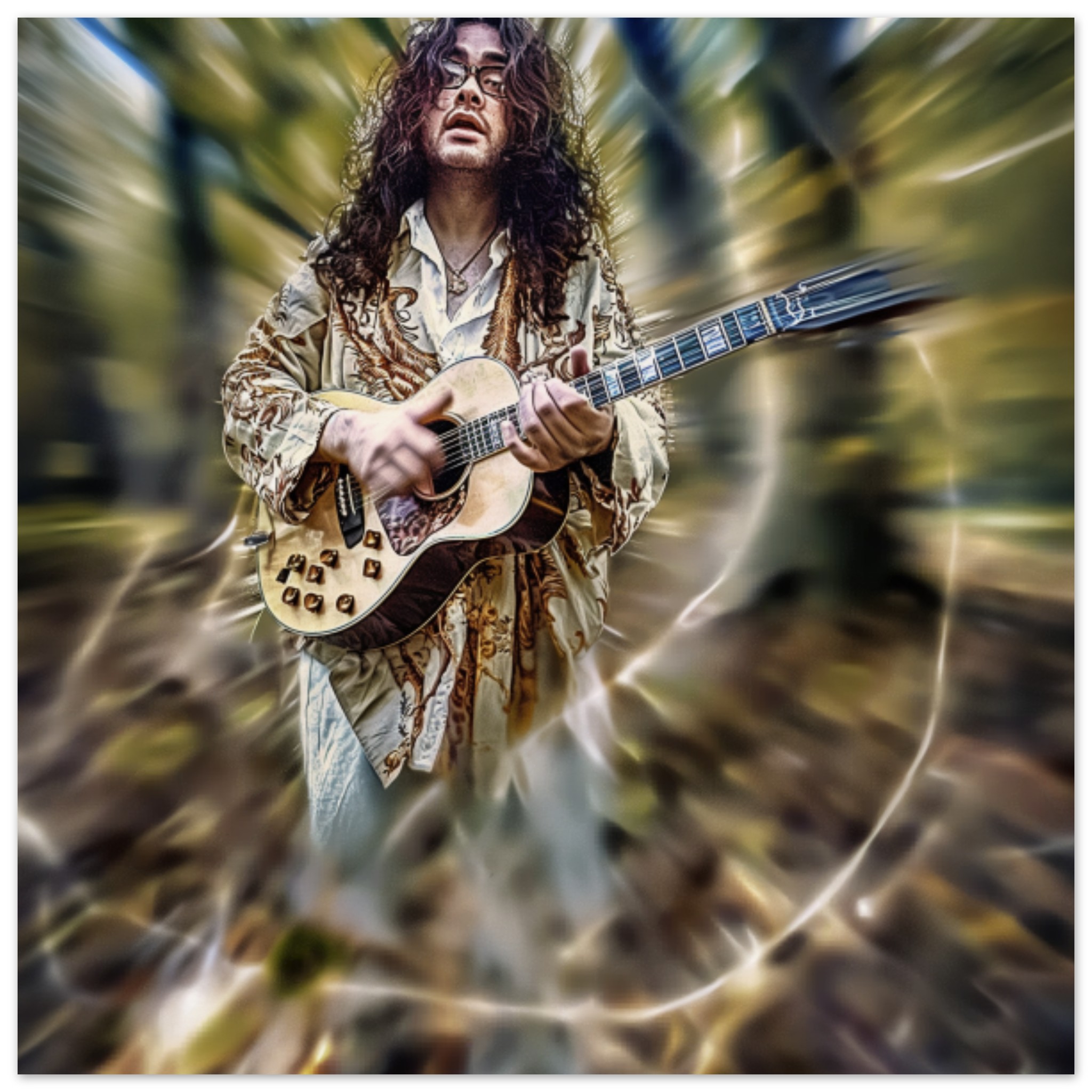 A man is playing a guitar at a concert. The image shows the man standing outdoors, strumming the guitar with a focused expression. The background is black, emphasizing the grey color of the man’s outfit. The dominant colors in the image are grey, with an accent color of 2D4563. The guitar is the main object in the image, located towards the center with a bounding box of x:131, y:223, w:398, h:240. The image is not in black and white and does not contain any adult, racy, or gory content.