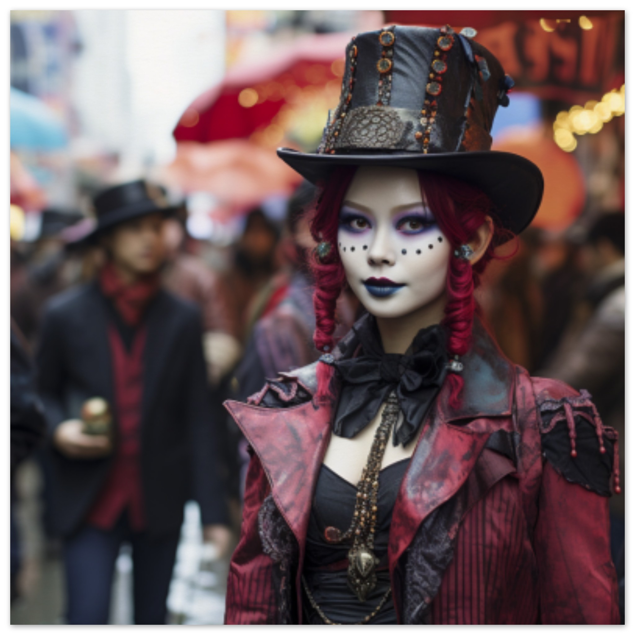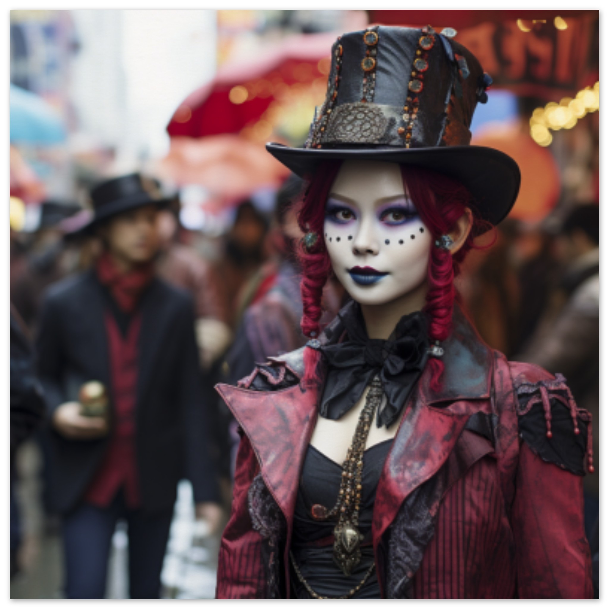 A woman is standing outdoors wearing a black jacket and a fedora hat. She is also wearing a masque or mask on her face, possibly a Halloween costume or cosplay. The woman’s face is partially obscured by the mask, adding a mysterious element to her attire. The image is dominated by shades of black, with a warm accent color of A0782B. She is standing in front of a building, adding a street fashion vibe to her overall look. The woman’s outfit and accessories suggest a sense of style and individuality.