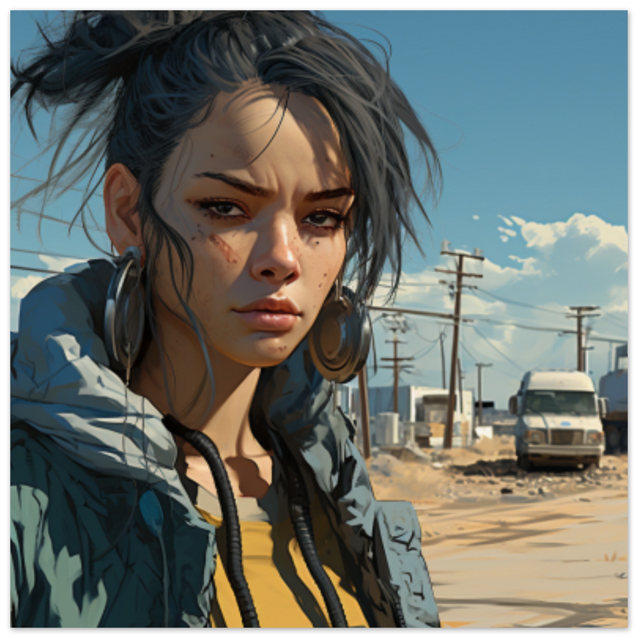 A woman with dark hair styled in a ponytail is wearing large earrings and a blue jacket. She stands outside, with a blue sky and clouds in the background. The image also includes two blurry white trucks parked on the ground. The woman’s face is partially visible, showing her human face. The dominant colors in the image are black and grey, with an accent color of teal. The woman is the main focus of the image, with a land vehicle in the foreground and background. Overall, the scene depicts a woman in an outdoor setting with vehicles nearby.