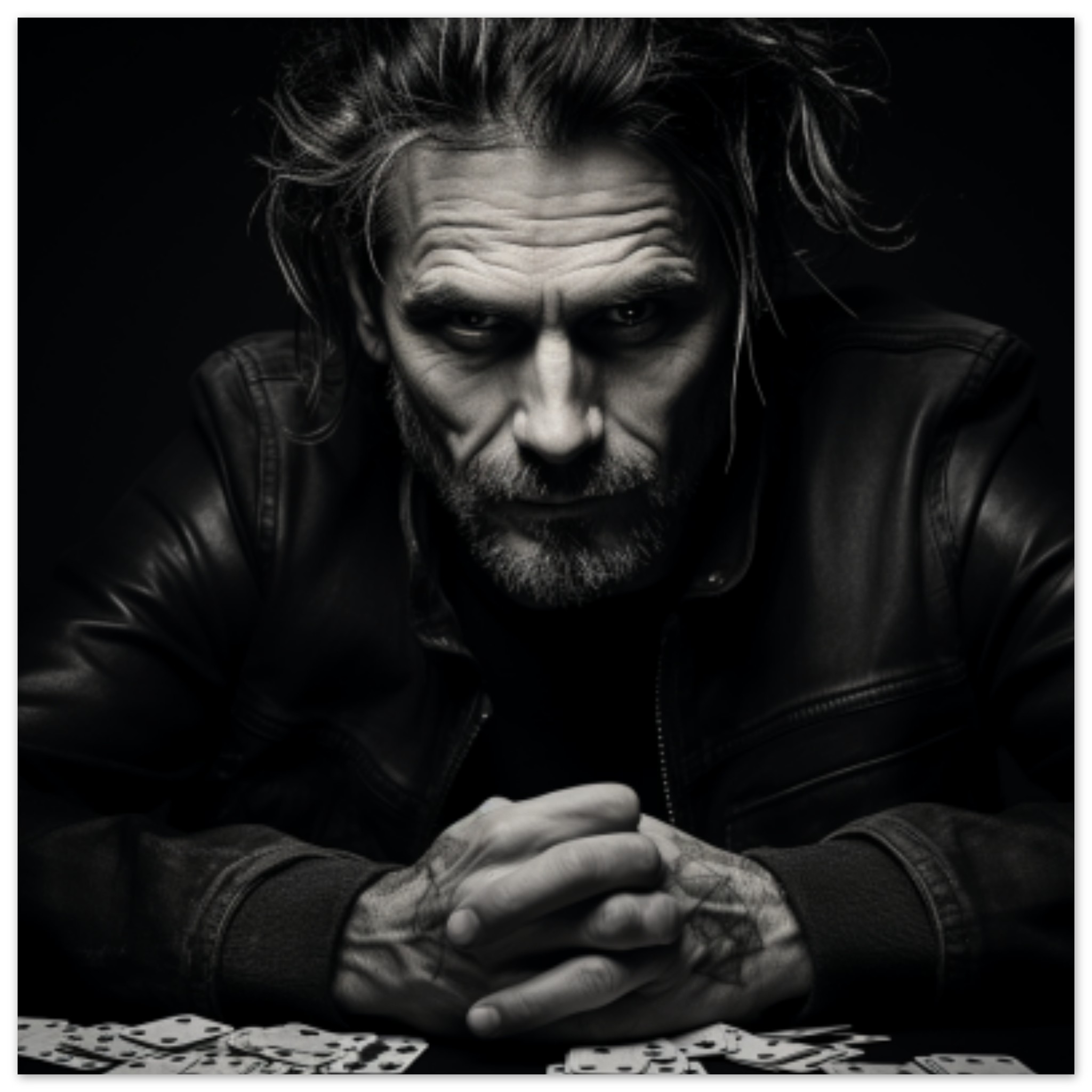 A black and white image featuring a man with a beard and long hair, sitting at a table with playing cards. The man’s face is the main focus, with a close-up revealing intricate facial details. He has a mustache and is wearing casual clothing. The background is also black, emphasizing the man’s presence. The image is indoors, with a monochrome aesthetic. The man’s expression is neutral, as he engages in a game of cards. The overall atmosphere is calm and focused, capturing a moment of concentration and strategy.