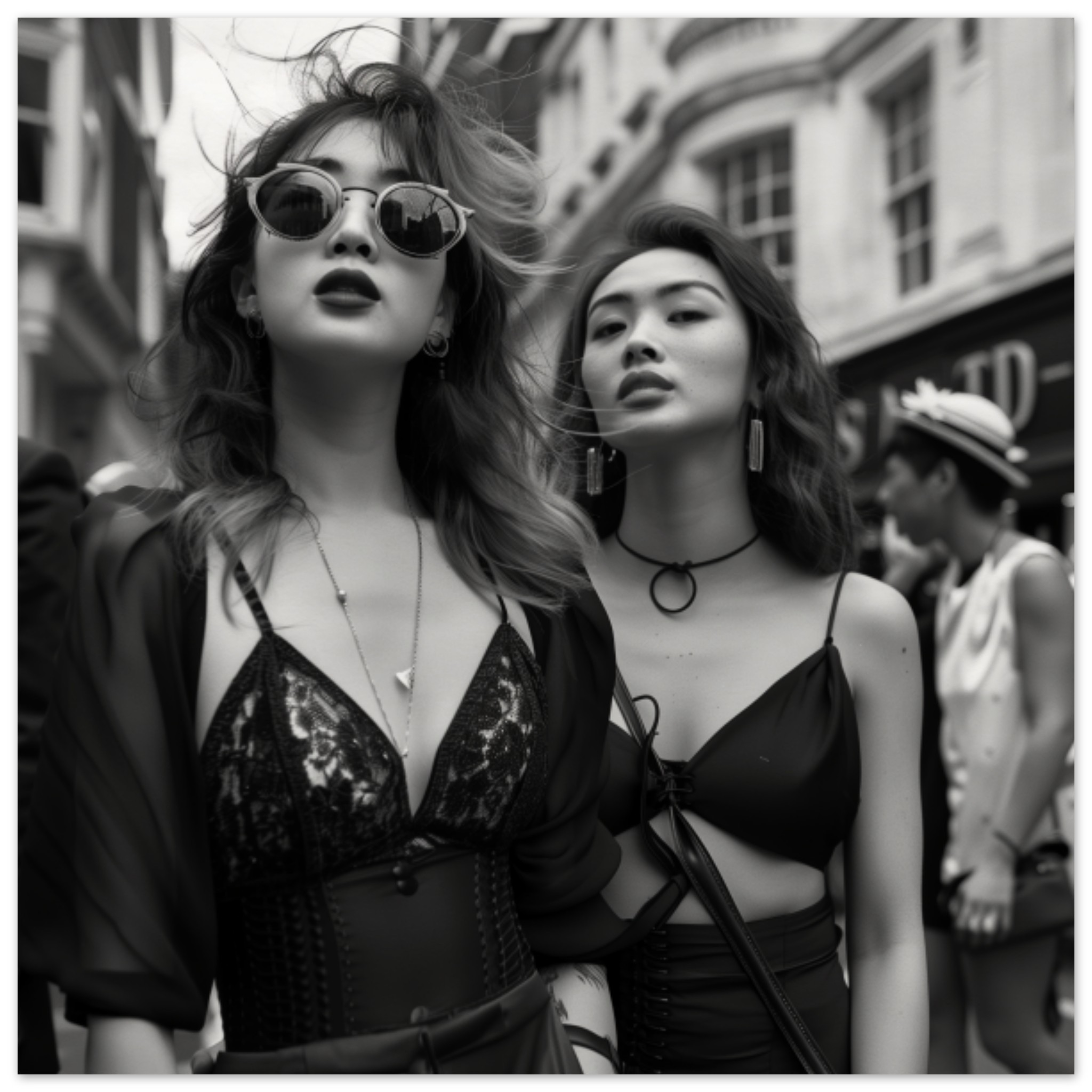 Two stylish women are posing for a picture outdoors. One woman is wearing sunglasses and a black dress, while the other is in an academic gown. The women have long hair and are standing elegantly. The dominant colors in the image are black, grey, and white. The background is black, and the foreground is grey. The image is in black and white. The women’s faces are visible, and one of them is wearing sunglasses. The women appear to be in a street fashion setting, exuding confidence and style.