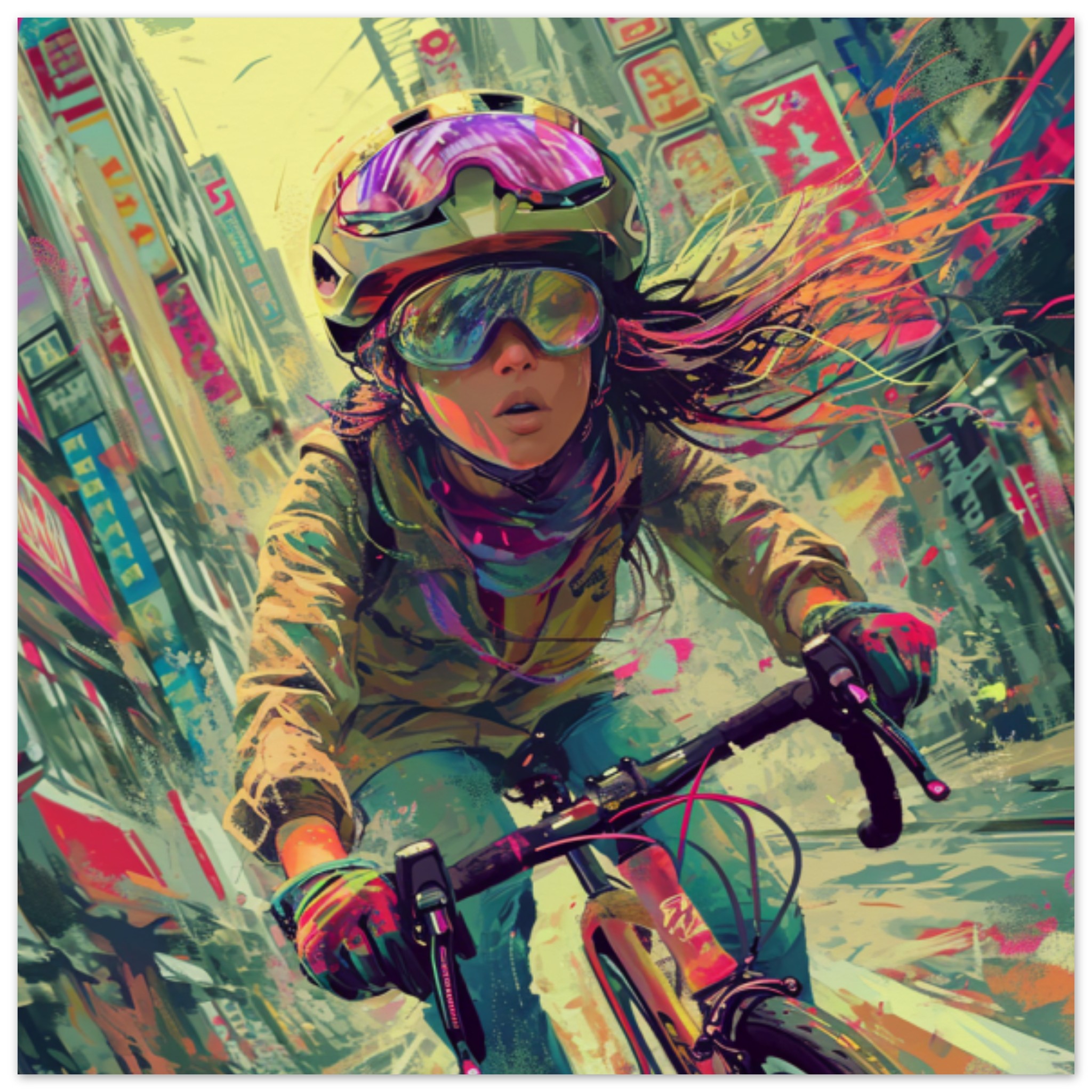 A detailed painting of a girl riding a bicycle is depicted in this image. The artwork showcases a brown-haired girl in the foreground, wearing a casual outfit. She is joyfully riding a yellow bicycle, with the bicycle wheel prominently visible. The painting is a close-up, with intricate details capturing the movement and energy of the scene. The background is minimal, allowing the focus to be on the central subject. The artwork is a vibrant and colorful representation of a person enjoying a bike ride, evoking a sense of freedom and happiness.