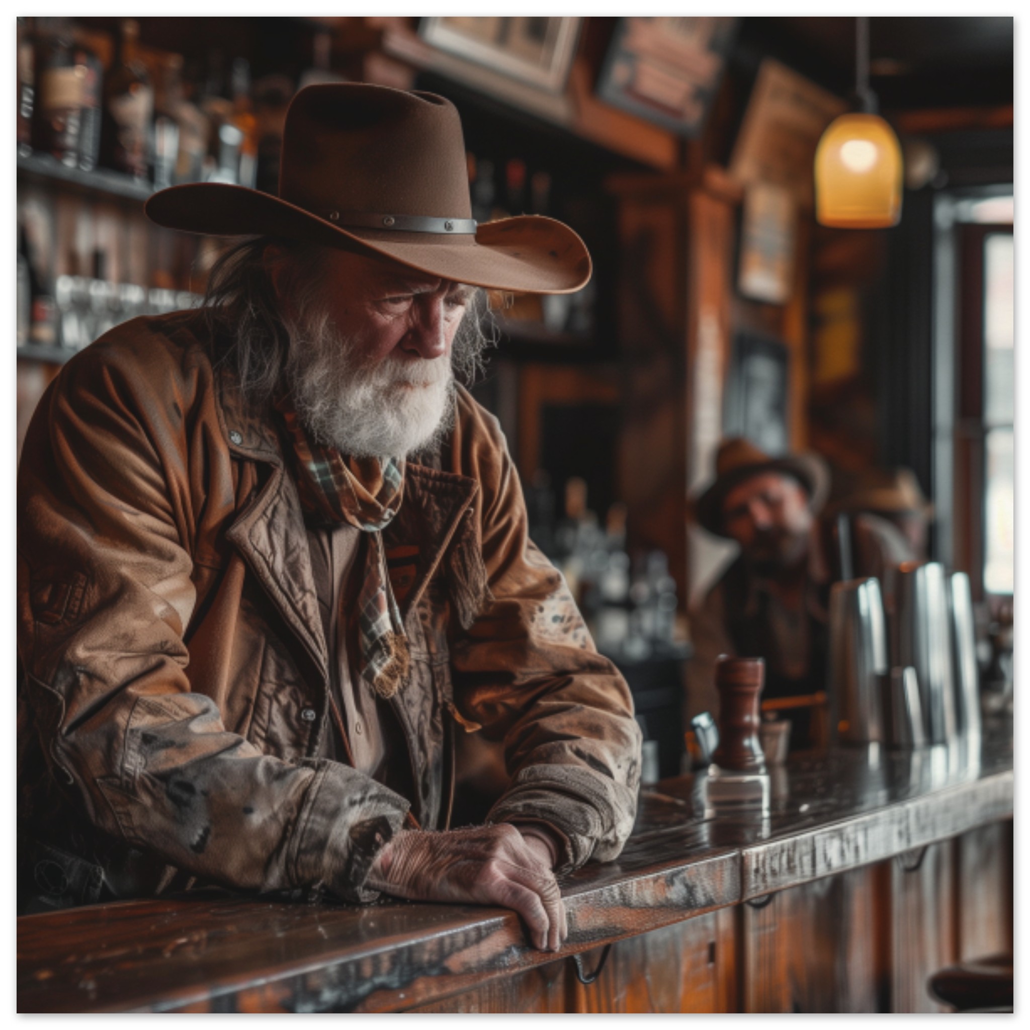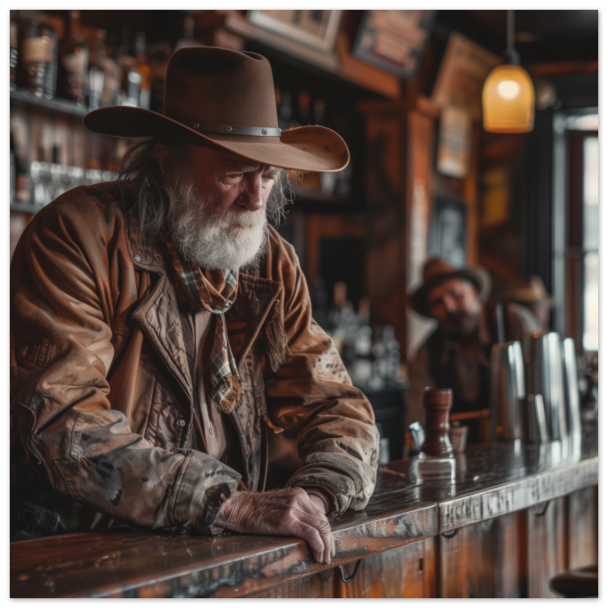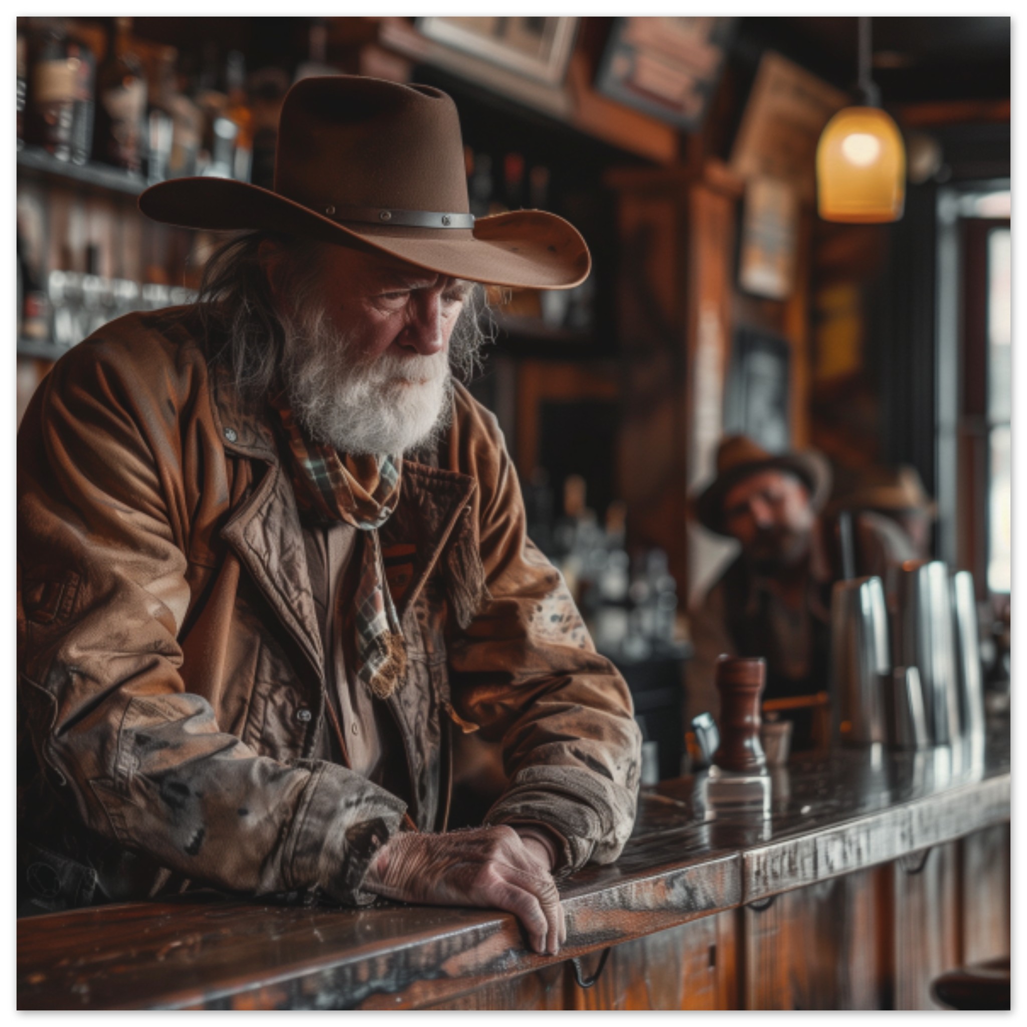 A man wearing a cowboy hat is leaning casually on a wooden bar in a dimly lit pub. He has a fedora on top of his cowboy hat, adding to his stylish appearance. The man is sitting comfortably, with his hand resting on the bar. The image focuses on the man’s headwear, highlighting his unique fashion accessory. The background is dark, with a hint of brown and grey tones. The scene exudes a relaxed and laid-back atmosphere, perfect for a night out at the bar.