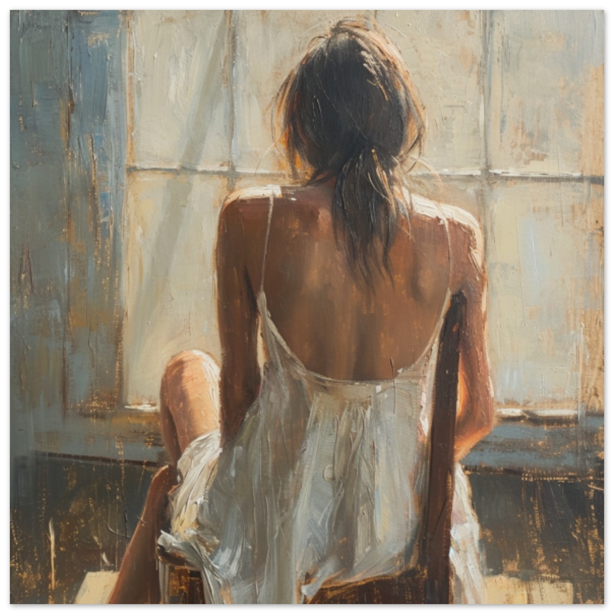A detailed painting capturing a woman sitting in a chair, wearing a white dress. The artwork showcases the woman in a contemplative pose, with intricate detailing on her clothing and the surrounding setting. The dominant colors are brown and grey, adding a sense of warmth and depth to the composition. The woman’s figure is the focal point, positioned elegantly in the center of the painting. This piece of art exudes a sense of sophistication and poise, inviting viewers to admire the beauty and skill of the artist’s portrayal of the female form.
