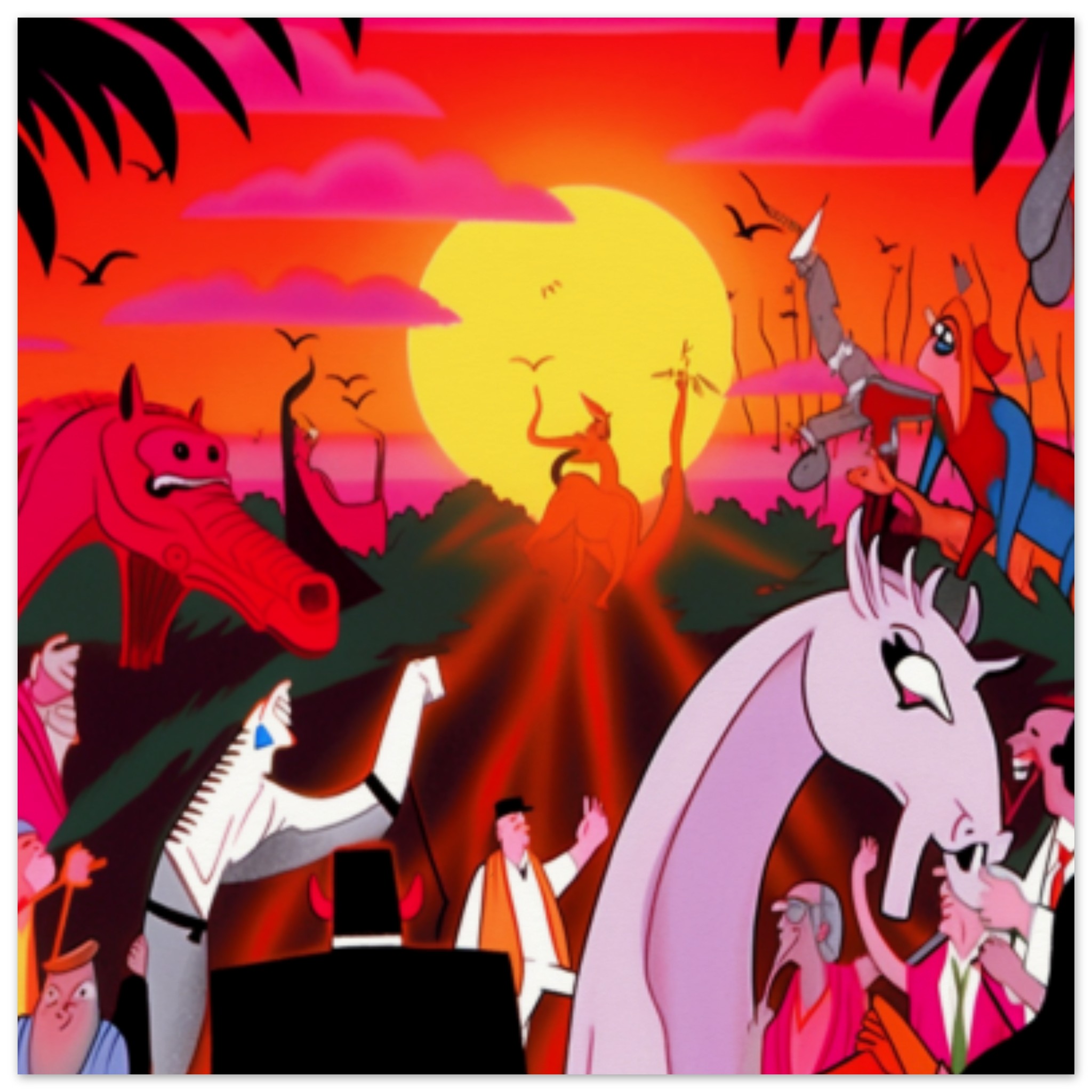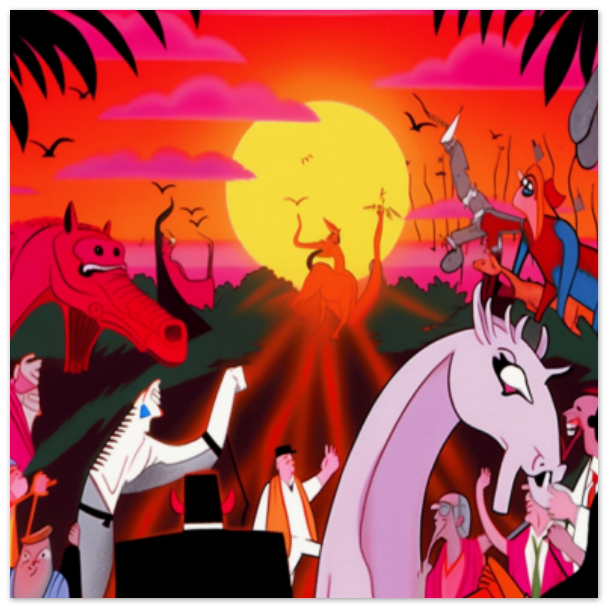 A colorful cartoon illustration set in a forest, featuring a diverse group of people engaging in various activities. The dominant colors in the image are red, pink, and black, with accents of a vibrant yellow. The scene includes a person wearing a white shirt and orange vest, as well as an animal in the foreground. The artwork has a whimsical and artistic style, resembling anime graphics. The composition is lively, with a magenta hue prevalent throughout. Overall, this cartoon depicts a joyful and imaginative forest setting with a touch of fantasy and dance elements.