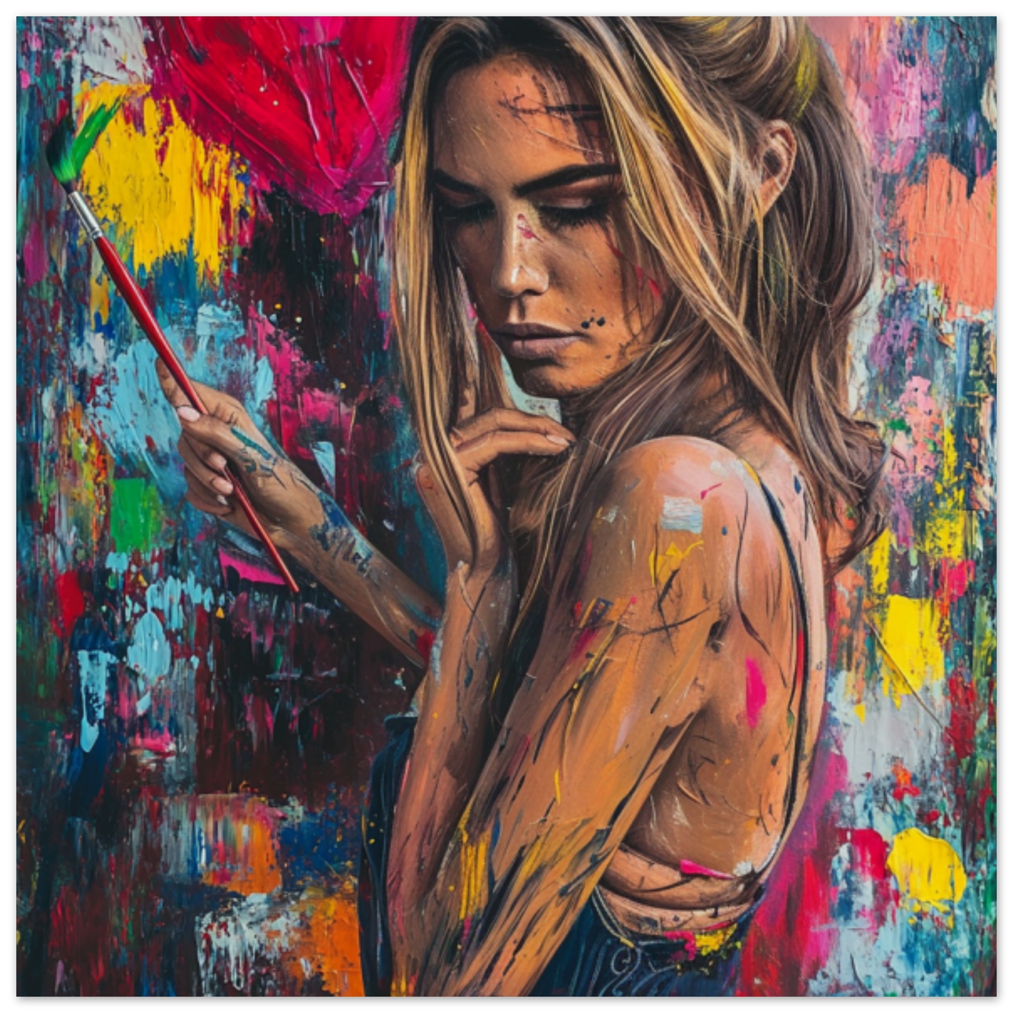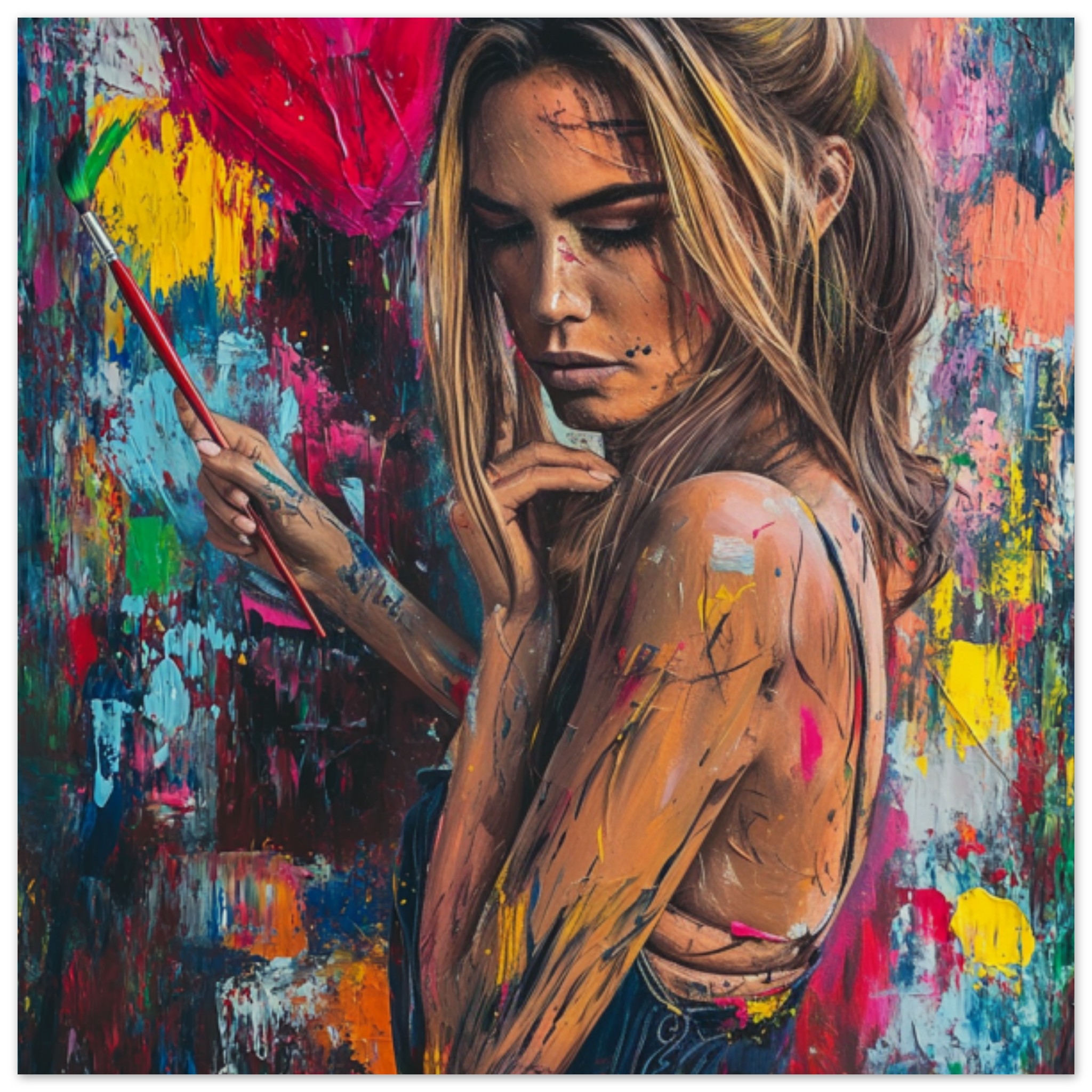 A woman is seen painting a wall in this image. The scene shows a person engaged in the act of painting, with a focus on their body as they work on the wall. The dominant colors in the image are brown and black, with an accent color of BB1034. The image is not black and white and does not contain any adult, racy, or gory content. The image falls under the category of abstract_nonphoto, with tags related to painting, drawing, art, human face, and modern art. The person in the image is the main object, with a bounding box provided for their location.