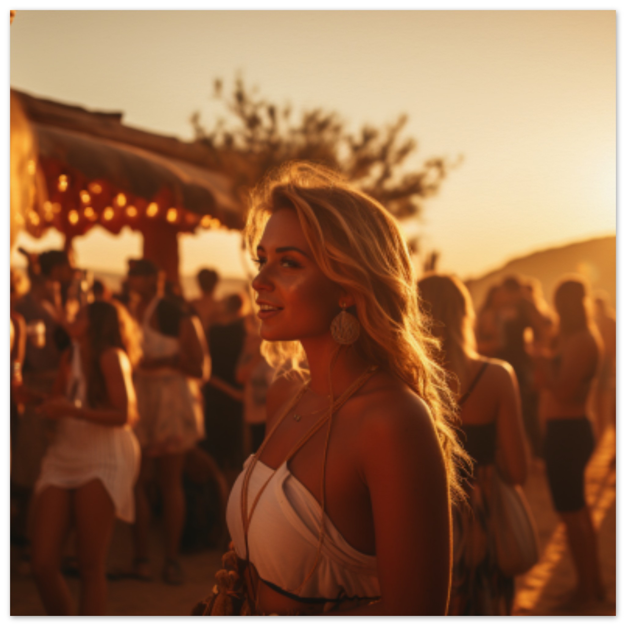 A woman in a white dress is standing outdoors in a crowded area at sunset. She has long blonde hair and is wearing a large earring. The dominant colors in the image are brown tones. The focal point is the woman in the white dress, with several other individuals visible in the background. The image is not black and white, with a hint of orange accent color. The woman’s face is not visible, but her back, chest, and leg are partially shown. Overall, the scene captures a busy outdoor setting with the woman as the central figure.