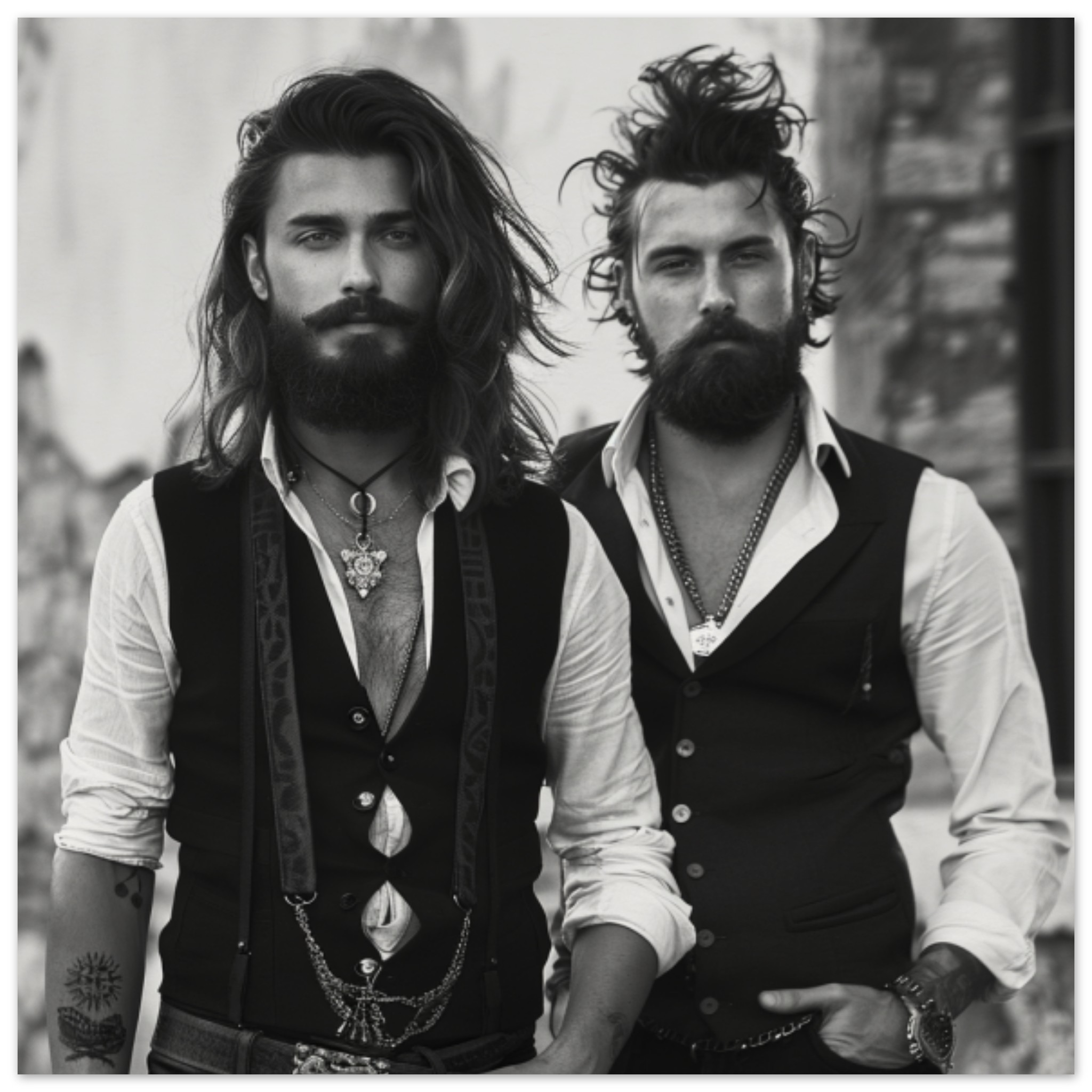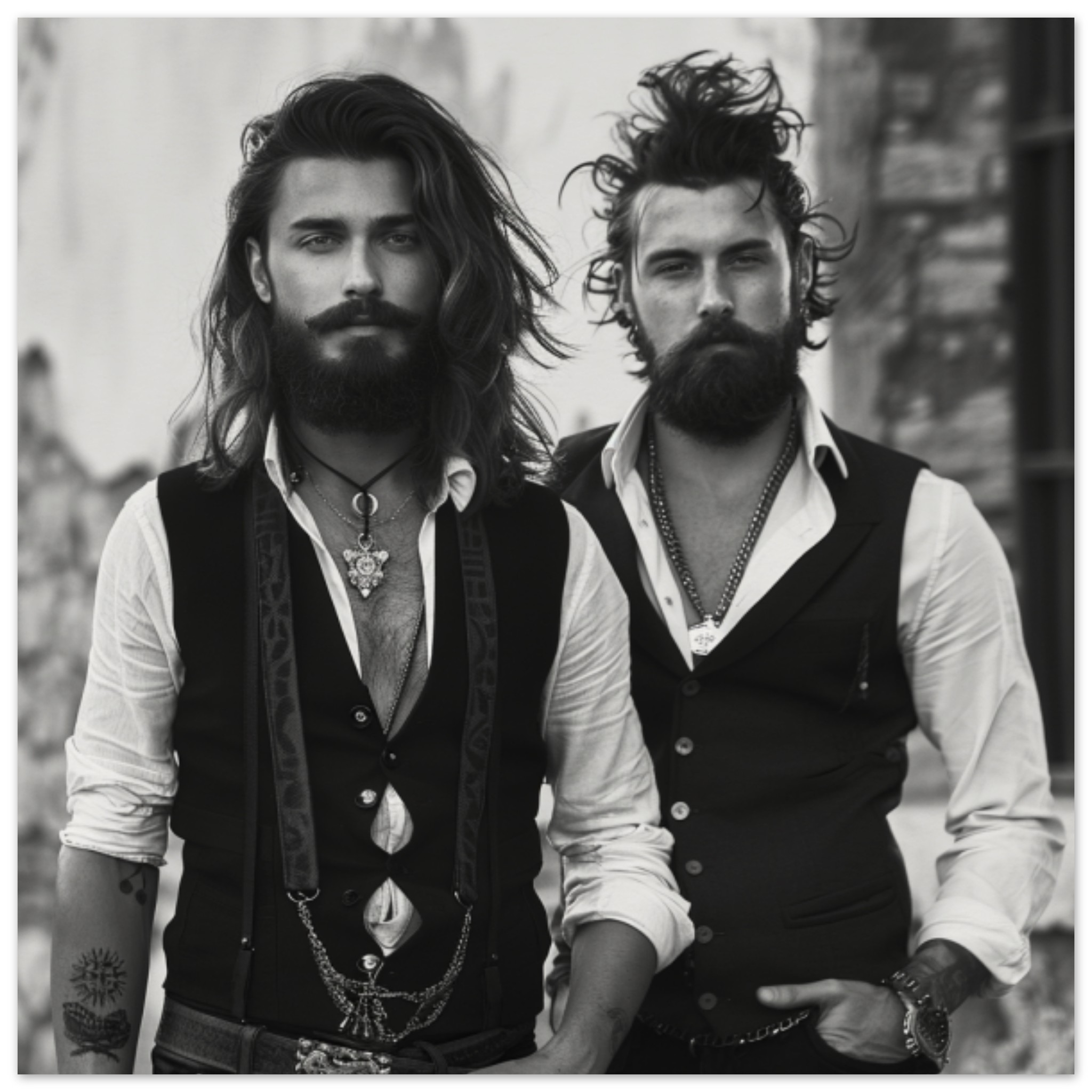Two men are posing for a picture outdoors. Both men have facial hair, one with long hair and a beard, and the other with a beard and mustache. They are wearing black and white clothing, with one man wearing a vest. The dominant colors in the image are black, grey, and white, with an accent color of a dark grey. The image is in black and white. The men are standing close together, with one man slightly to the left and the other slightly to the right. They both have serious expressions on their faces.