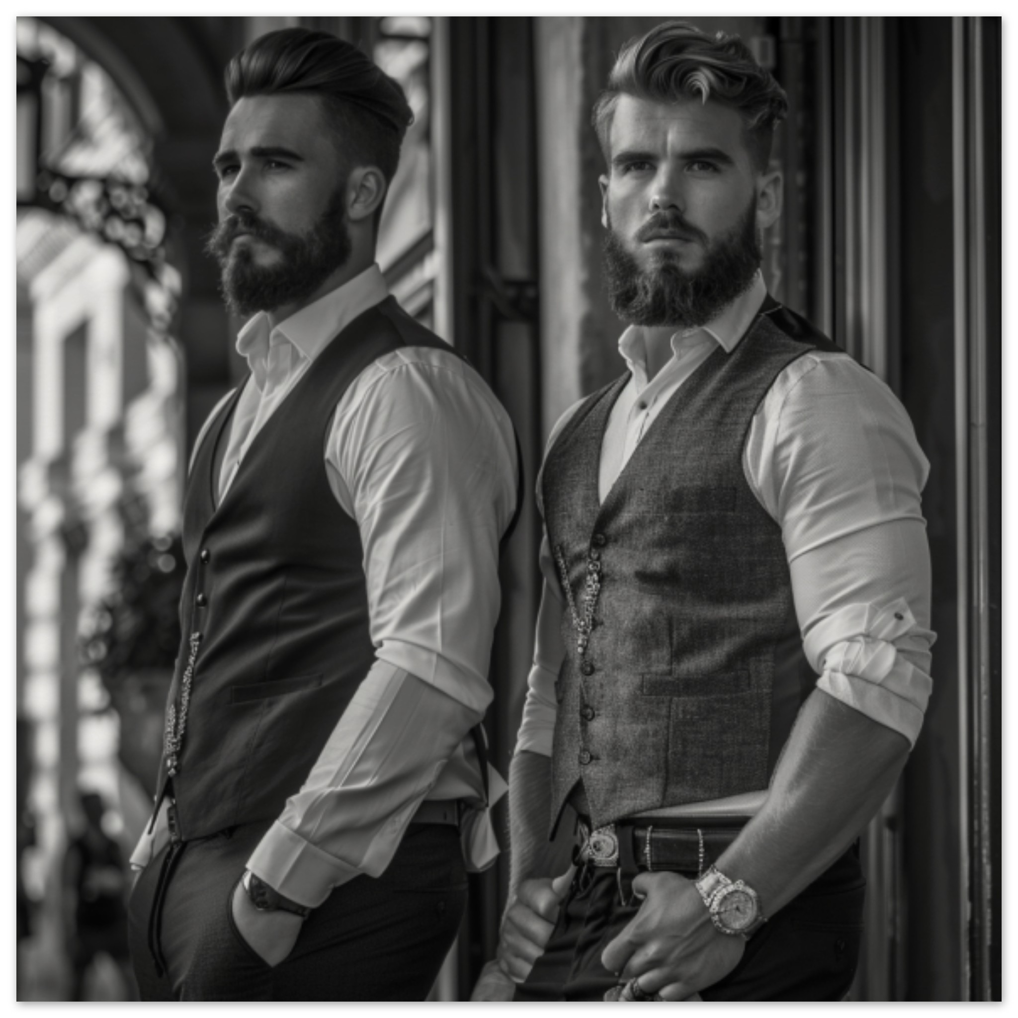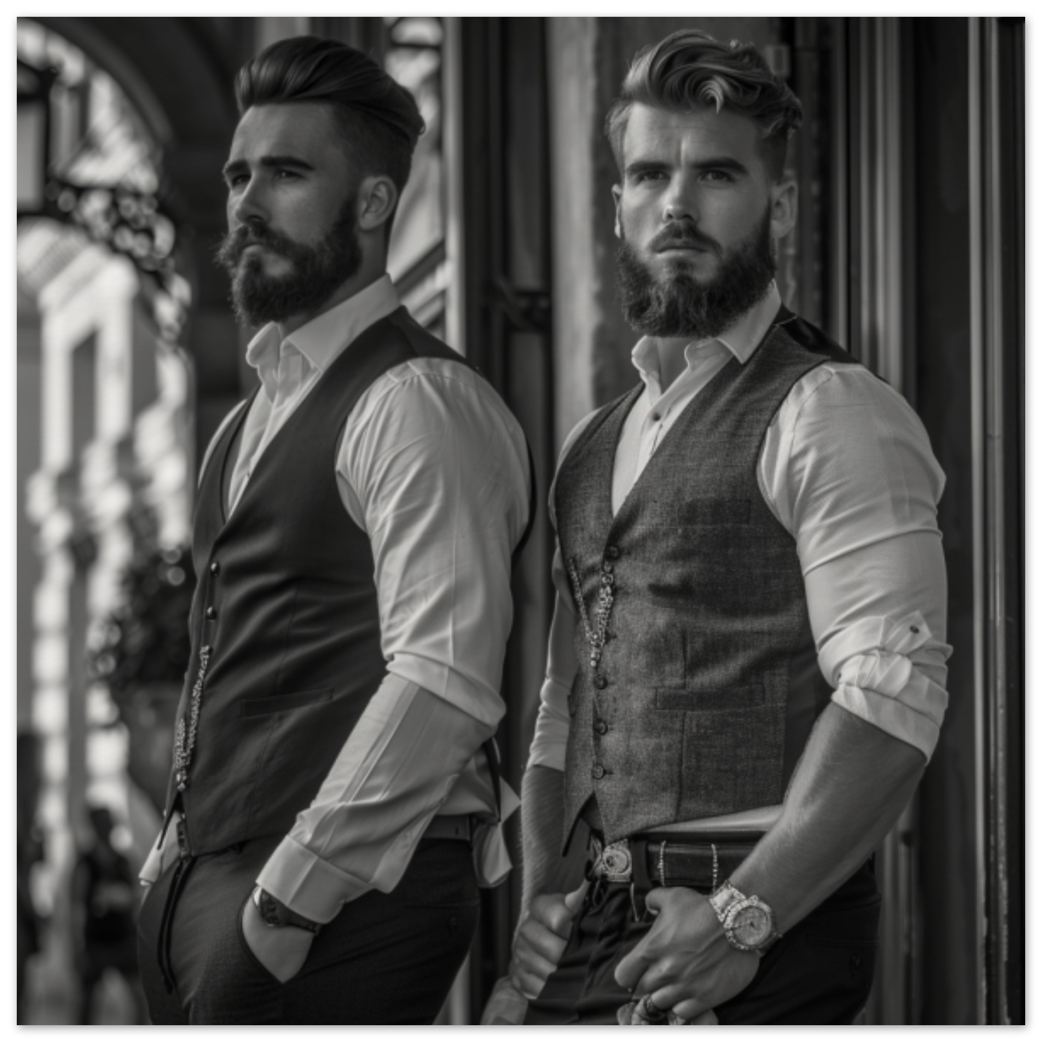 Two men are posing for a picture outdoors on a street. The black and white image shows a man with a beard wearing a vest. The dominant colors in the photo are black and grey, with an accent color of dark grey. Both men are dressed in classic attire, exuding a gentlemanly vibe. The men are the main focus of the picture, with one standing on the left side and the other on the right side. The background is a building with a black hue. The photo is monochrome, highlighting the timeless and elegant style of the men.