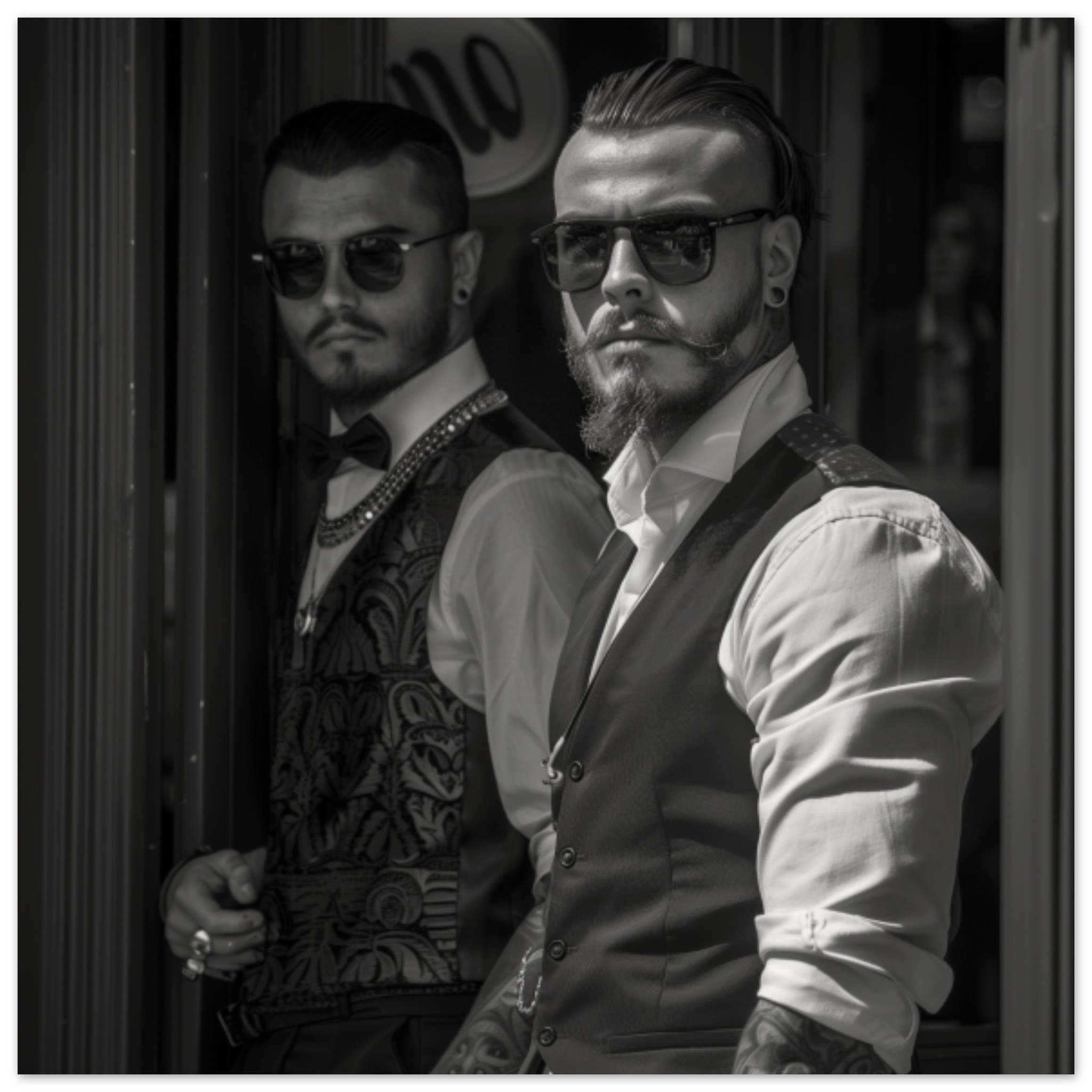 A group of two men, both wearing sunglasses, one in a vest and bow tie, stand in front of a glass door on a street. The image is in black and white, with the dominant colors being black and grey. Both men have prominent human faces, one with a close-up of a suit and the other in sunglasses. The men are standing outdoors, with one wearing glasses and a vest. The image is monochrome, with a focus on clothing and accessories. The men are stylishly dressed, exuding a sophisticated and fashionable vibe in this urban setting.
